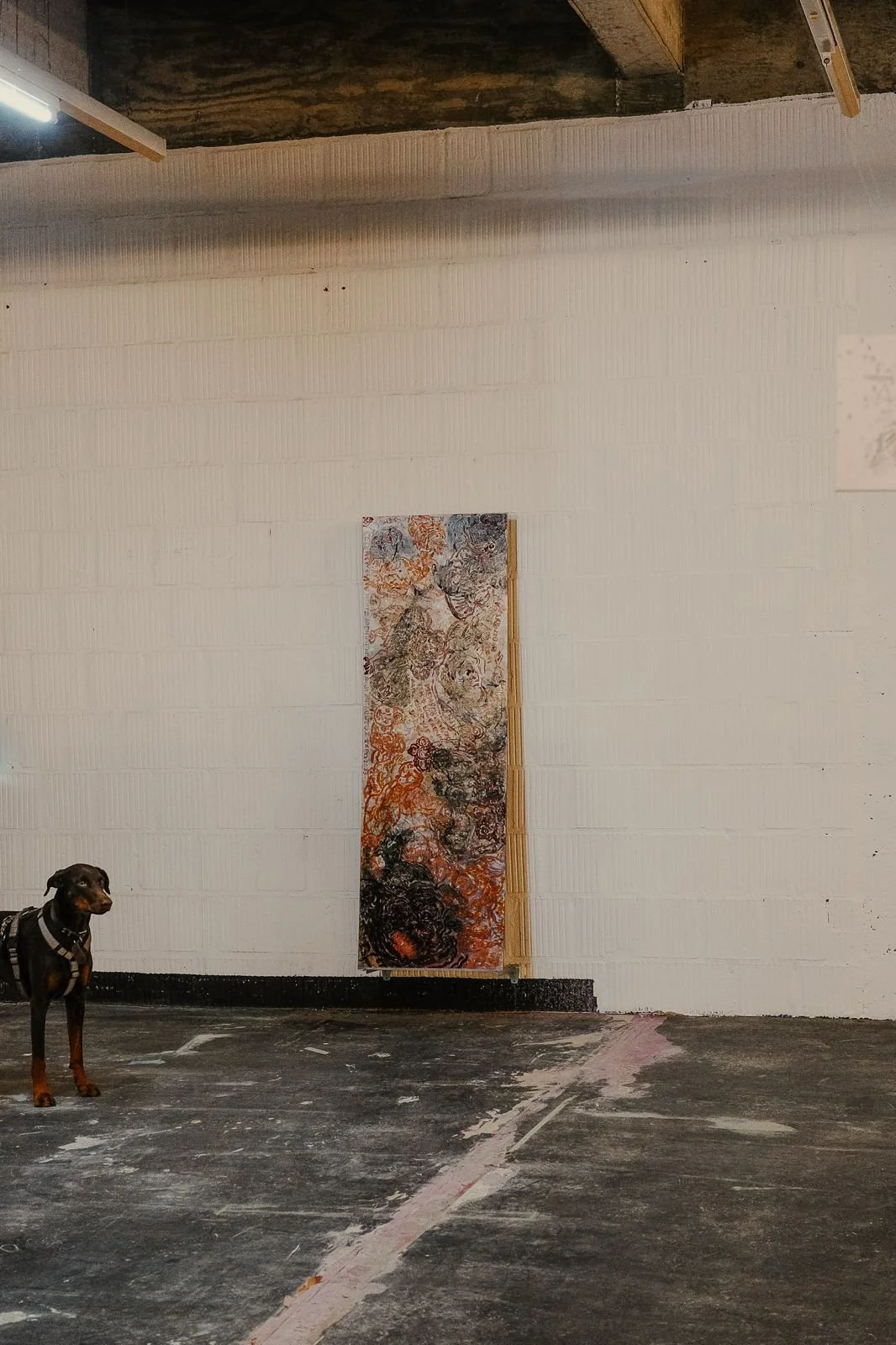 ”backwoods”, wood varnish, charcoal, pastel chalk, acrylic on paper, 150x196cm, Galerie Benjamin Eck, 2024, Munich, Germany
